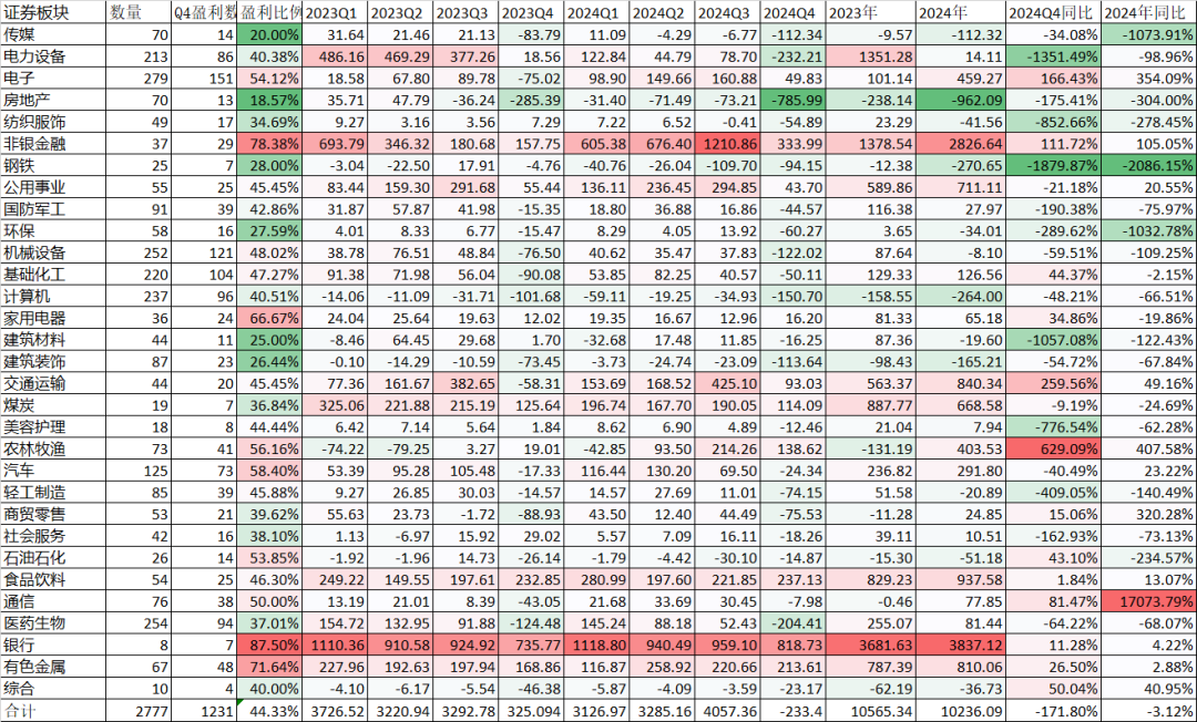 2777家公司中,2024年第4季度盈利的为1231家,盈利比例44.33%,分板块来看,2024Q4季度7个板块中除了上交所盈利外,其他6个全部板块亏损,下降幅度最大的科创板,Q4从去年同期亏损38.17亿到今年亏损162.24亿,下跌325.09%;创业板下跌207.45。与双创板块大幅度下跌形成鲜明对比的是上交所主板在Q4同比还增加了7.36%。而上交所、深交所的风险警示板分别同比上升了42.63%和16.05%,当然它们也没有盈利,只不过是同比亏损减少了。不管怎么说亏损减少总是好事情。
