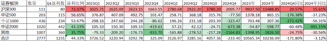 Q4盈利面最大的是沪深300板块,盈利比例高达72.07%,最低的是其他类,只有35.75%。Q4的5个规模板块,只有沪深300是同比增加了20.57%,从2023Q4的1663.55亿元,增加到2024Q4的2005.77亿元,其他几个板块不仅同比下降,而且整个板块都是亏损的,中证500从2023Q4的盈利101.47亿元到2024Q4的亏损77.50亿。反而是1007家公司的其他类,虽然2024Q4亏损了1164.83亿元,但同比2023Q4亏损933.70亿元,亏损增幅24.75%还是最少的。