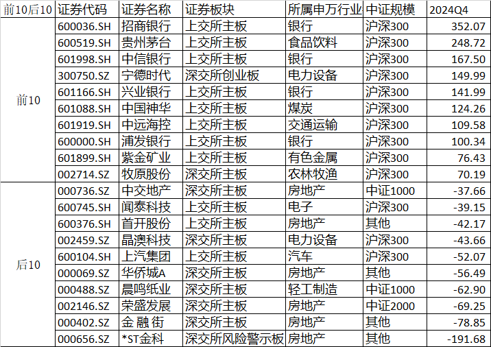 最后看一下2024Q4以公布的归母净利润的前10后10,前10里银行居多,后10里房地产居多: