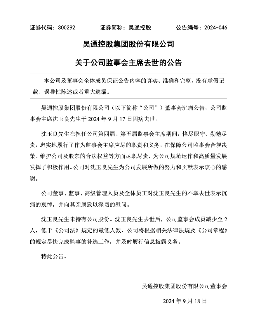 2024年9月18日,吴通控股发布公告称,公司监事会主席沈玉良于9月17日因病去世。