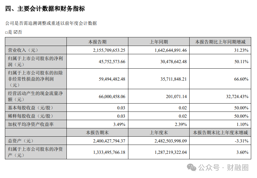今年上半年,公司实现营收21.56亿元,同比增长31.23%;归母净利润为4575.26万元,同比增长50.11%。